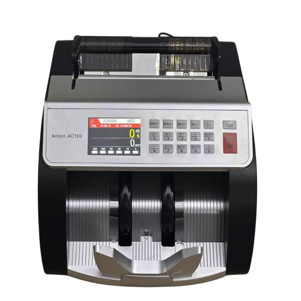 TL / EURO saymak ve sahtesini tespit etmek isteyen, kompak ve hesaplı para sayma makinesi ihtiyacı olan işletmeler için distribütör garantisi ile Action AC100 TL / EURO Kağıt Para Sayma Makinesi Kağıt Para Sayma Makinesi yeni nesil para sayma makinesi.