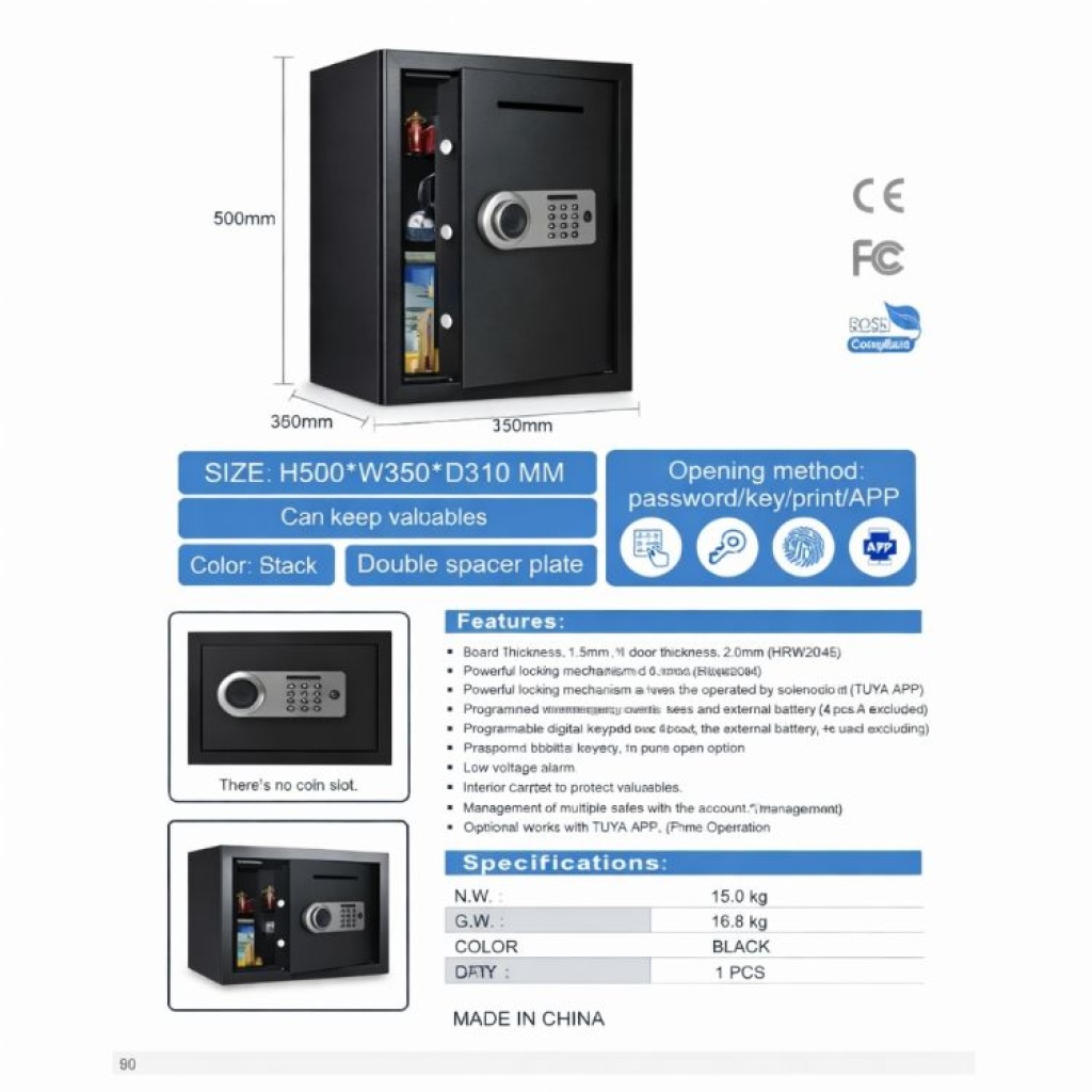Yaklaşık 31×35×50 cm ebatlarıyla ciddi büyüklükte değerli evrak, nakit, dijital depolama cihazları gibi “küçük ama önemli” saklama ihtiyaçlarını karşılayabilir.